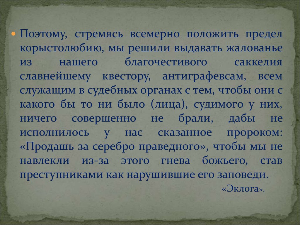 Поэтому, стремясь всемерно положить пределкорыстолюбию, мы решили выдавать жалованье