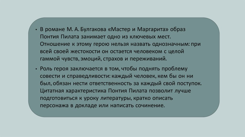 Понтий Пилат –один из яркихобразов в творчестве Булгакова. Он