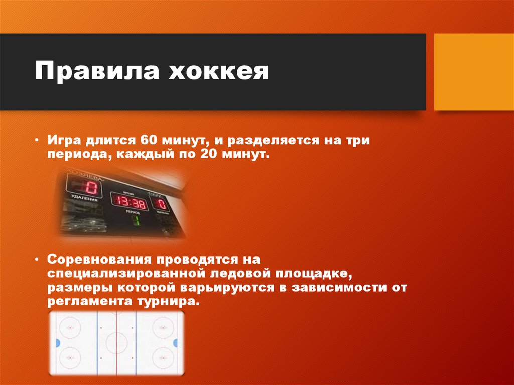Правила хоккея• Игра длится 60 минут, и разделяется на три