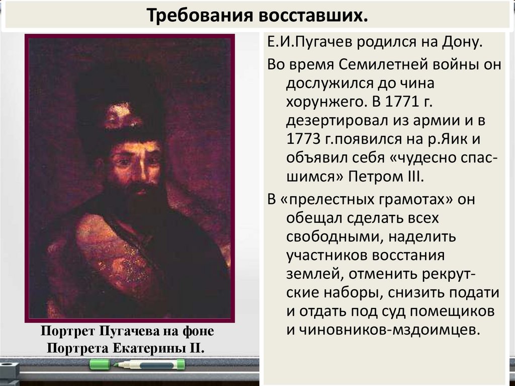 Портрет Пугачева на фонеПортрета Екатерины II.