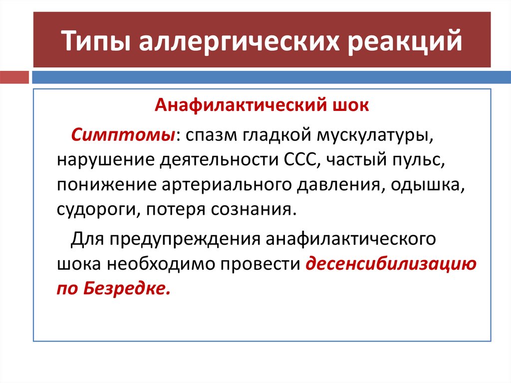 Анафилактический шокСимптомы: спазм гладкой мускулатуры,