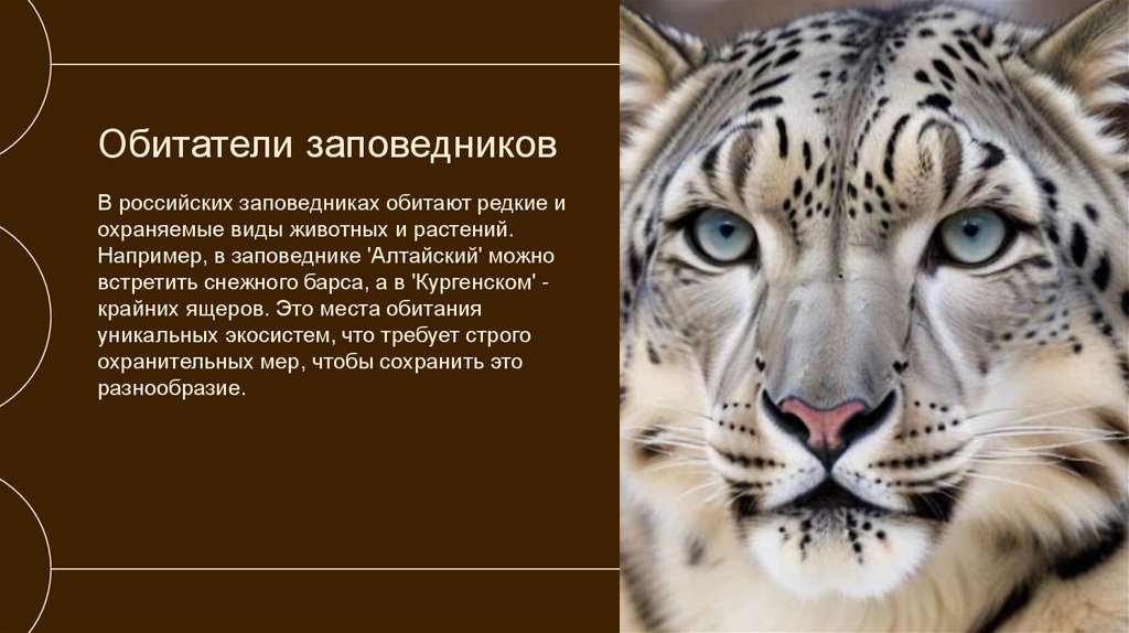 Обитатели заповедниковВ российских заповедниках обитают редкие и