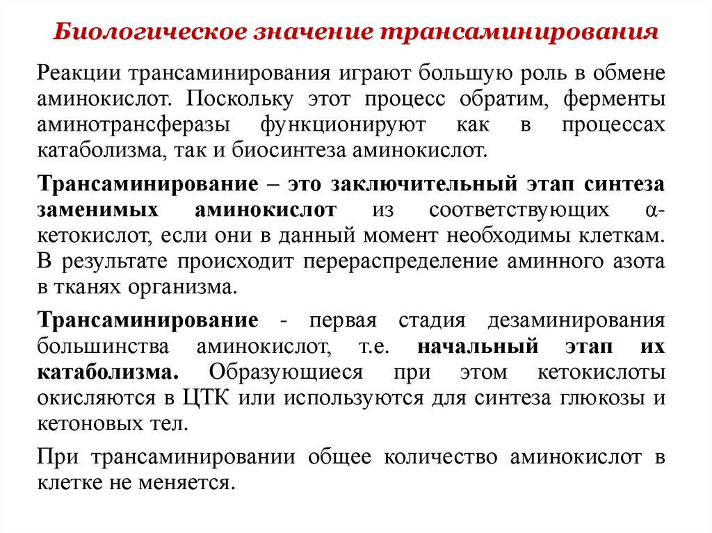 Реакции трансаминирования играют большую роль в обменеаминокислот. Поскольку этот процесс обратим, ферменты