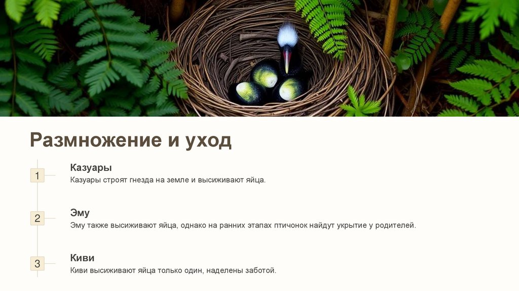 Эму также высиживают яйца, однако на ранних этапах птичонок найдут укрытие у родителей.