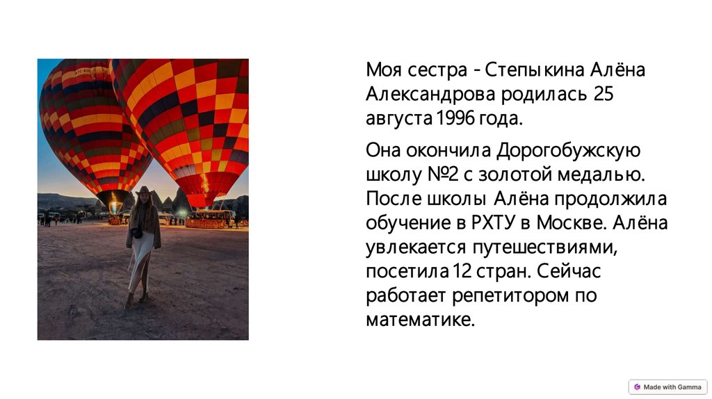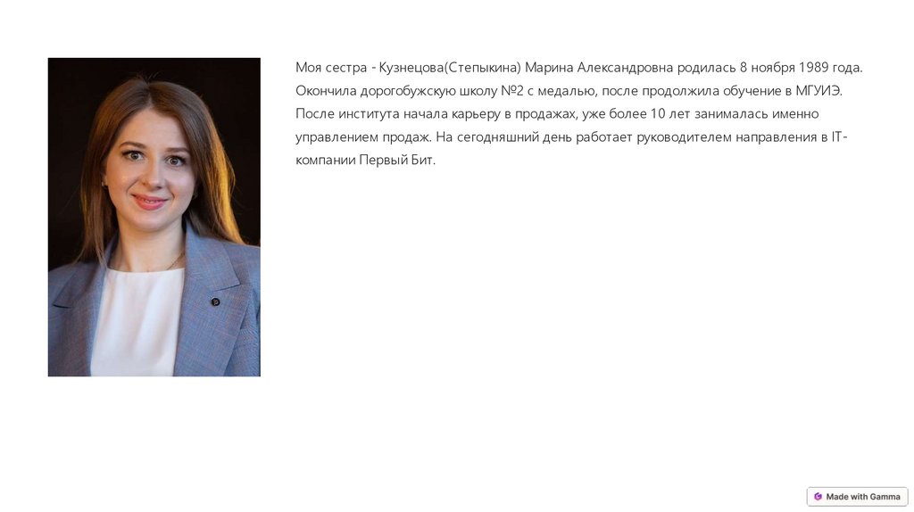 Моя сестра - Кузнецова(Степыкина) Марина Александровна родилась 8 ноября 1 989 года.Окончила дорогобужскую школу №2 с медалью, после продолжила обучение в МГУИЭ.