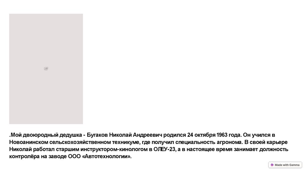 .Мой двоюродный дедушка - Бугаков Николай Андреевич родился 24 октября 1963 года. Он учился вНовоанинском сельскохозяйственном техникуме, где получил специальность агронома. В своей карьере