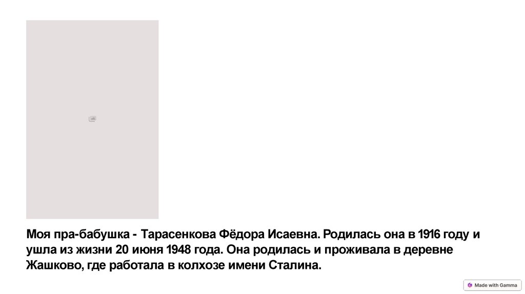 Моя пра-бабушка - Тарасенкова Фёдора Исаевна. Родилась она в 1916 году иушла из жизни 20 июня 1948 года. Она родилась и проживала в деревне