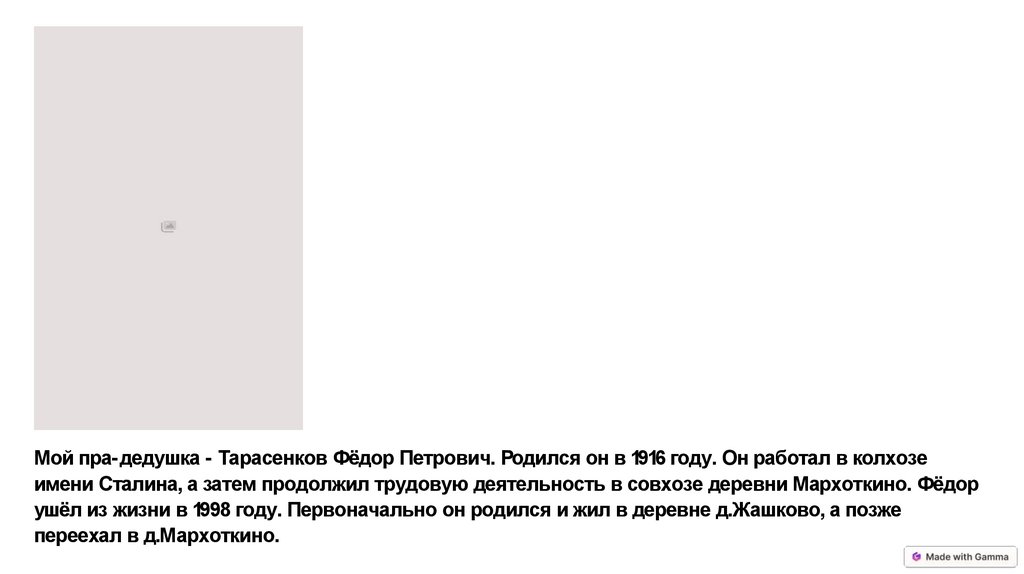 Мой пра-дедушка - Тарасенков Фёдор Петрович. Родился он в 1916 году. Он работал в колхозеимени Сталина, а затем продолжил трудовую деятельность в совхозе деревни Мархоткино. Фёдор