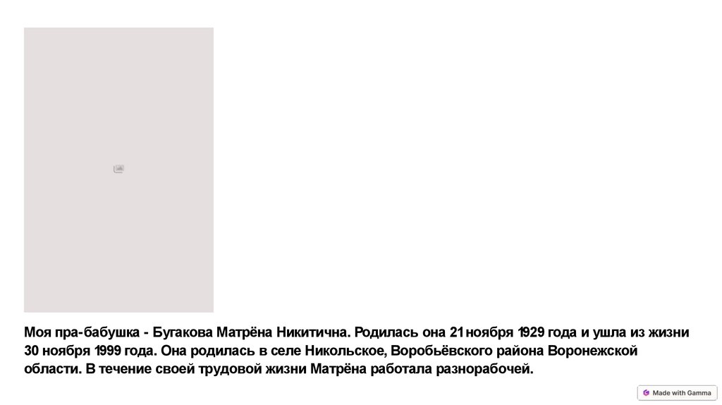 Моя пра-бабушка - Бугакова Матрёна Никитична. Родилась она 21 ноября 1929 года и ушла из жизни30 ноября 1999 года. Она родилась в селе Никольское, Воробьёвского района Воронежской