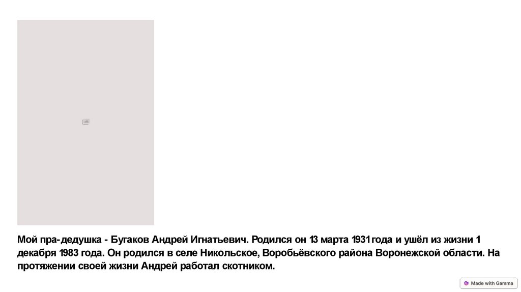 Мой пра-дедушка - Бугаков Андрей Игнатьевич. Родился он 13 марта 1931года и ушёл из жизни 1декабря 1983 года. Он родился в селе Никольское, Воробьёвского района Воронежской области. На