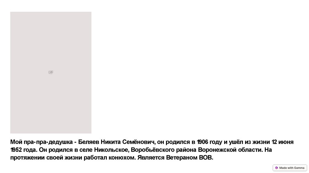 Мой пра-пра-дедушка - Беляев Никита Семёнович, он родился в 1906 году и ушёл из жизни 12 июня1952 года. Он родился в селе Никольское, Воробьёвского района Воронежской области. На