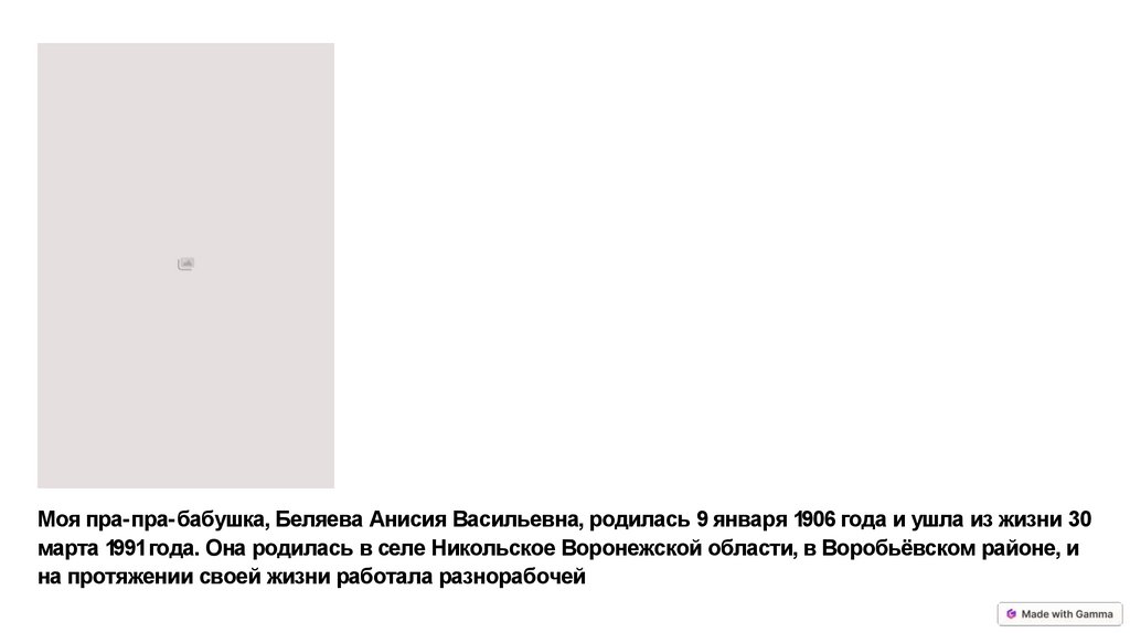 Моя пра-пра-бабушка, Беляева Анисия Васильевна, родилась 9 января 1906 года и ушла из жизни 30марта 1991года. Она родилась в селе Никольское Воронежской области, в Воробьёвском районе, и