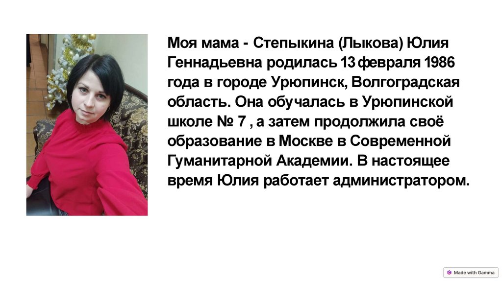 Моя мама - Степыкина (Лыкова) ЮлияГеннадьевна родилась 13 февраля 1986