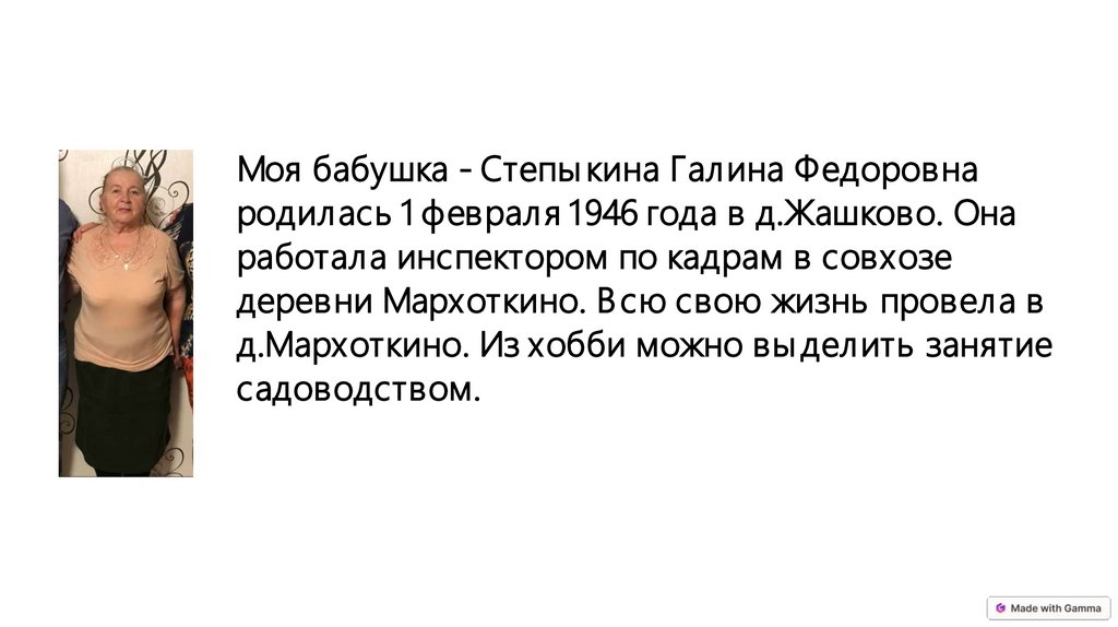 Моя бабушка - Степы кина Галина Федоровнародилась 1 февраля 1946 года в д.Жашково. Она