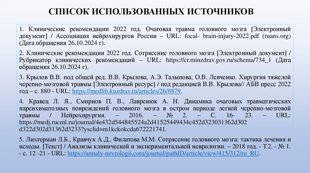 СПИСОК ИСПОЛЬЗОВАННЫХ ИСТОЧНИКОВ1. Клинические рекомендации 2022 год. Очаговая травма головного мозга [Электронный