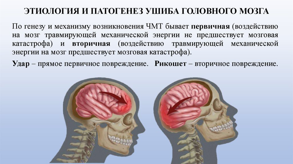 ЭТИОЛОГИЯ И ПАТОГЕНЕЗ УШИБА ГОЛОВНОГО МОЗГАПо генезу и механизму возникновения ЧМТ бывает первичная (воздействию