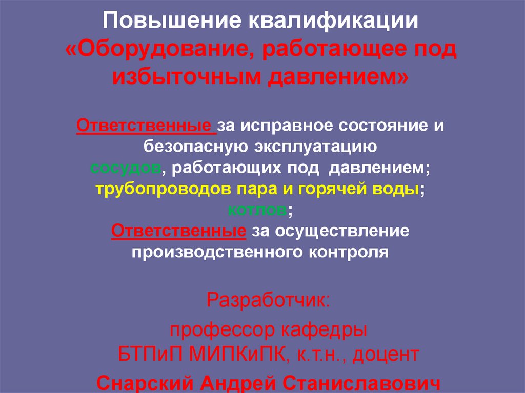 1. Повышение квалификации «Оборудование, работающее под избыточным давлением» Ответственные за исправное состояние и безопасную