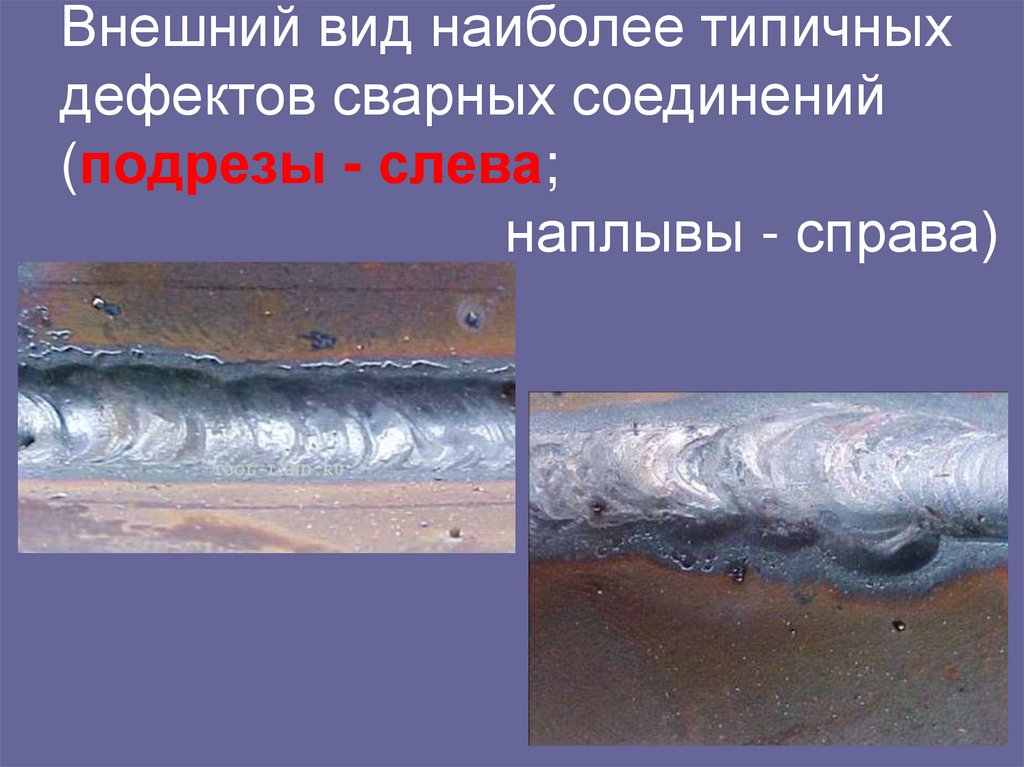 194. Внешний вид наиболее типичных дефектов сварных соединений (подрезы - слева; наплывы - справа)