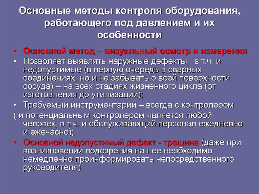 181. Основные методы контроля оборудования, работающего под давлением и их особенности