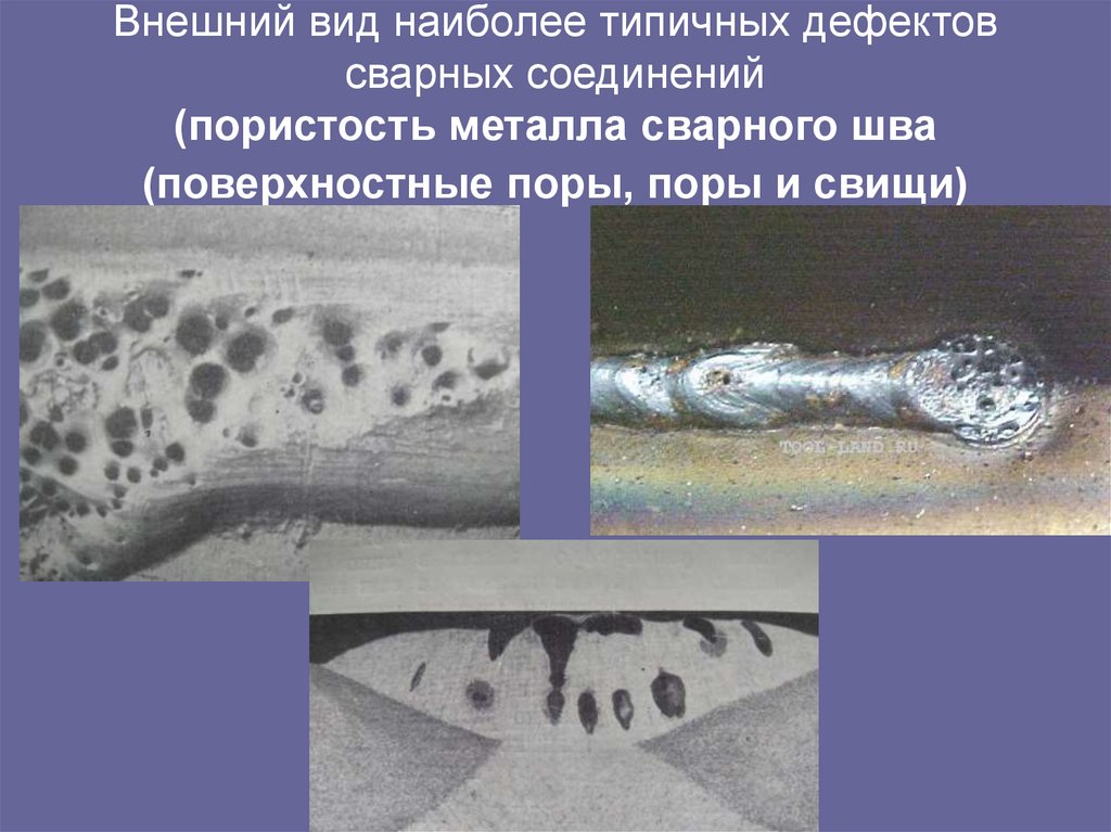 192. Внешний вид наиболее типичных дефектов сварных соединений (пористость металла сварного шва (поверхностные поры, поры и свищи)