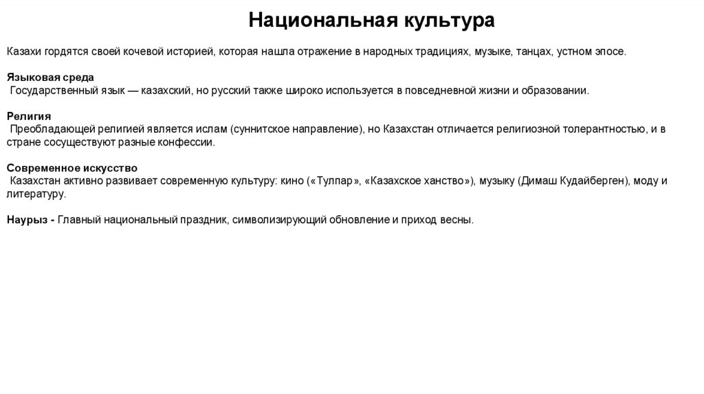 Национальная культураКазахи гордятся своей кочевой историей, которая нашла отражение в народных традициях, музыке, танцах, устном эпосе.