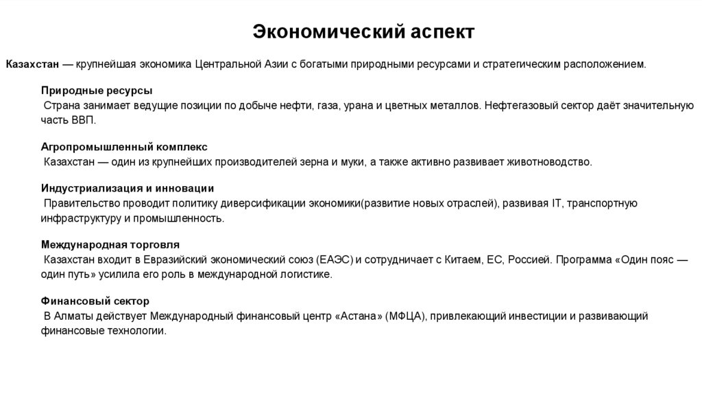 Экономический аспектКазахстан — крупнейшая экономика Центральной Азии с богатыми природными ресурсами и стратегическим расположением.