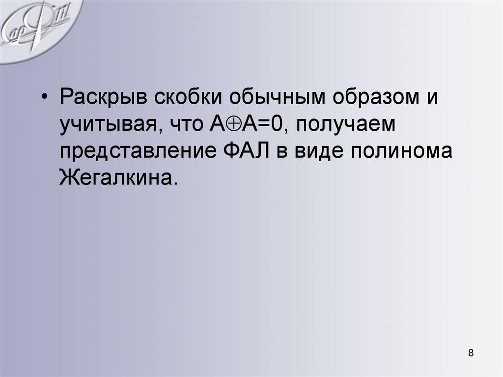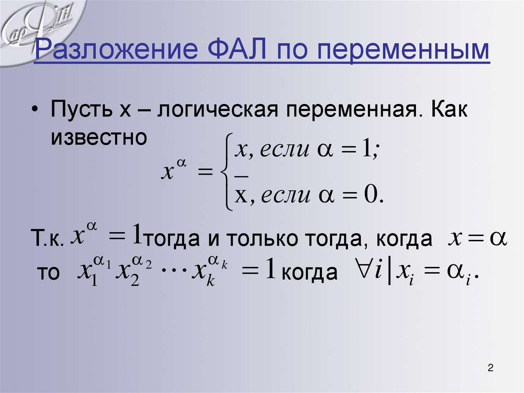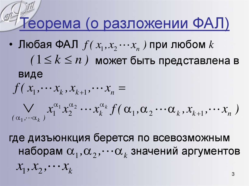• Любая ФАЛ f ( x1 , x2 xn ) при любом k( 1 k n ) может быть представлена в
