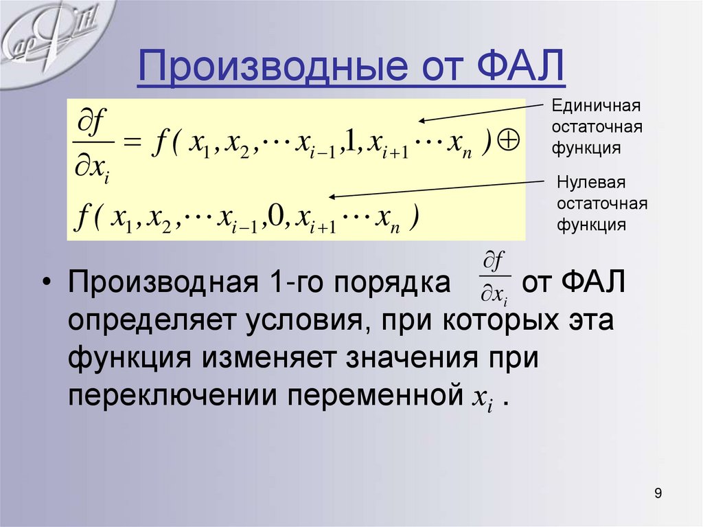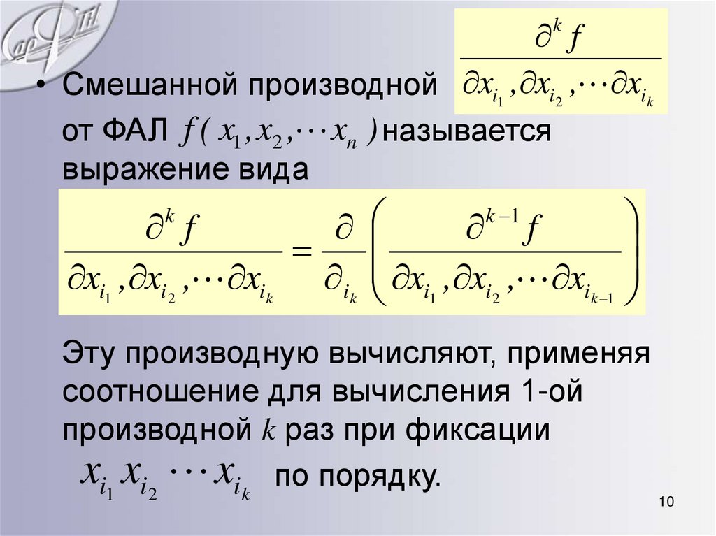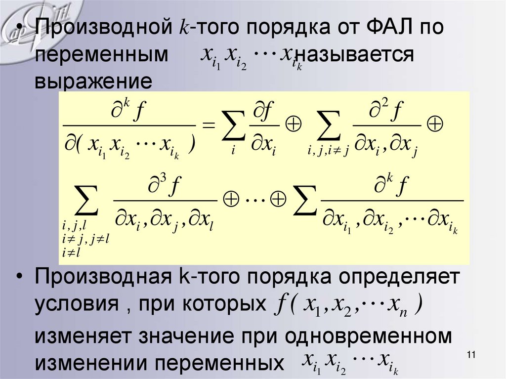• Производной k-того порядка от ФАЛ попеременным xi1 xi2 xiназывается