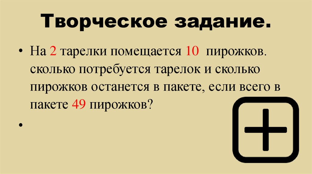 Творческое задание.• На 2 тарелки помещается 10 пирожков.
