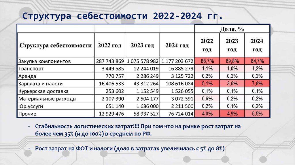 - Рост затрат на ФОТ и налоги (доля в затратах увеличилась с 5% до 8%)