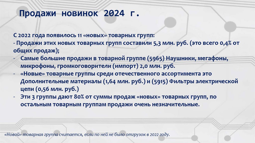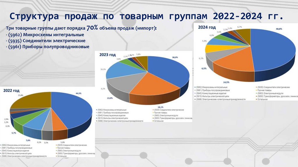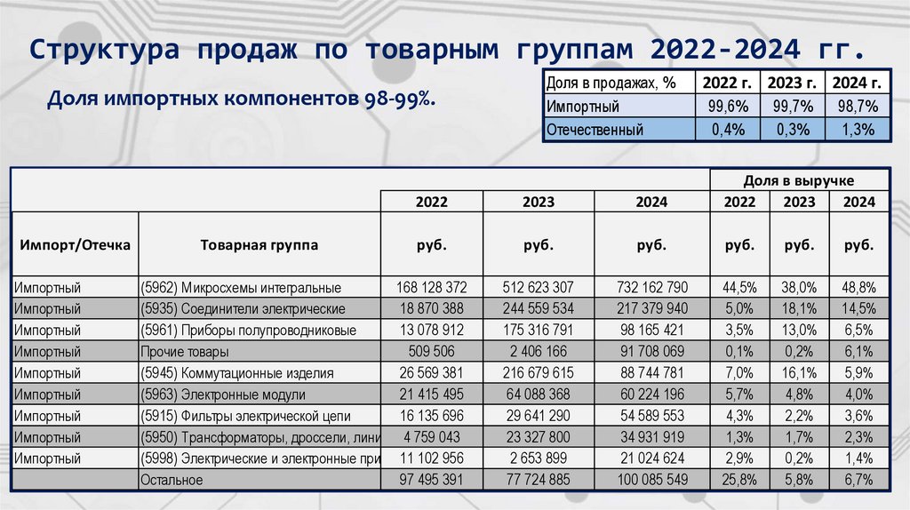 Структура продаж по товарным группам 2022-2024 гг.Доля импортных компонентов 98-99%.