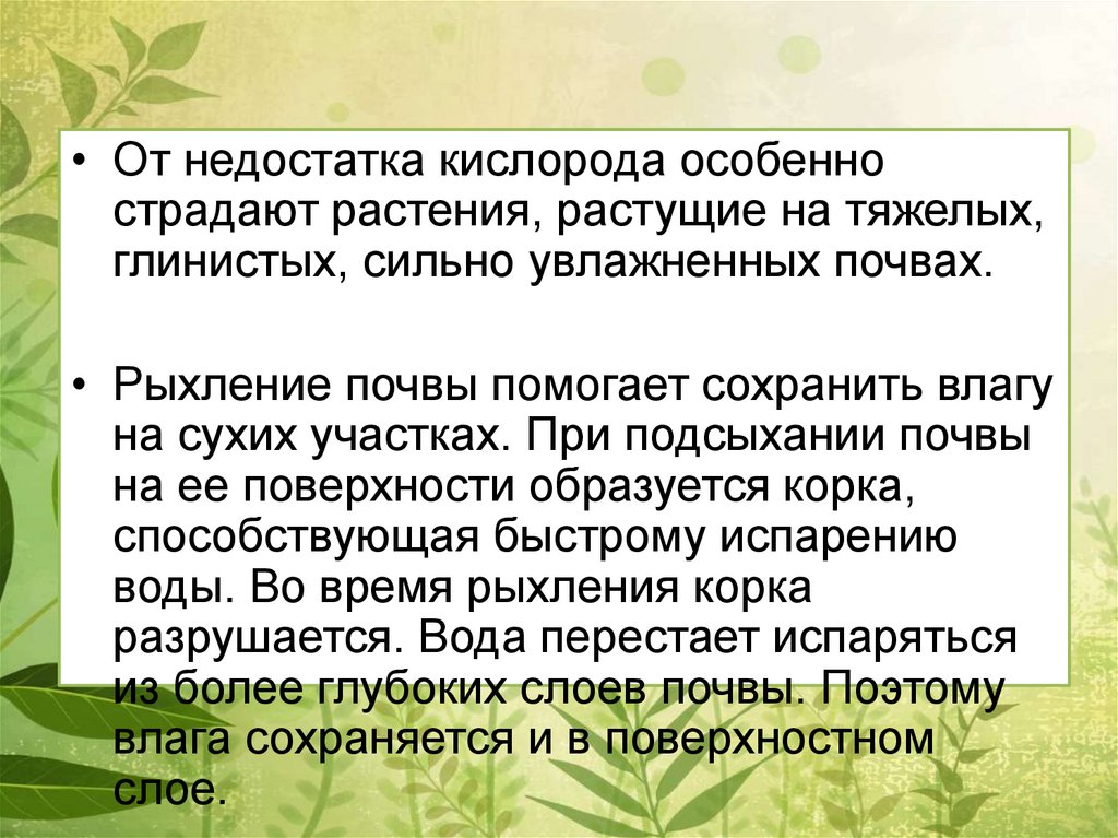 • От недостатка кислорода особеннострадают растения, растущие на тяжелых,