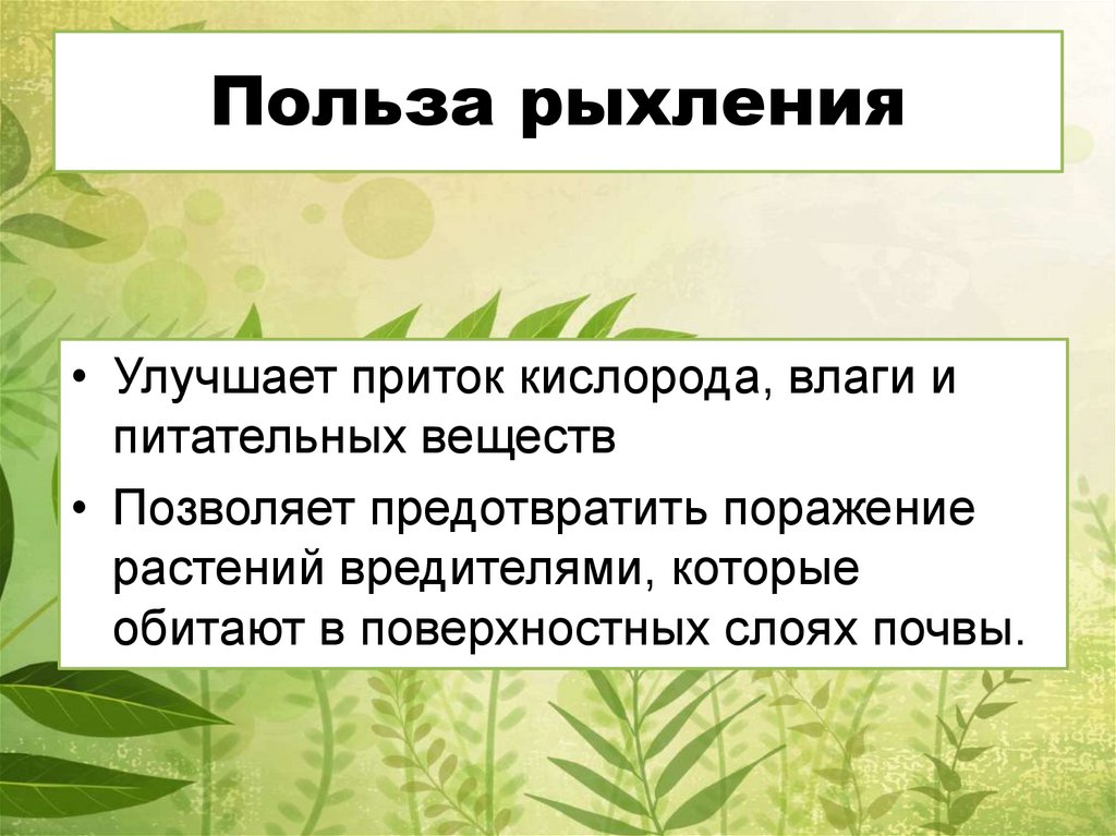 Польза рыхления• Улучшает приток кислорода, влаги и