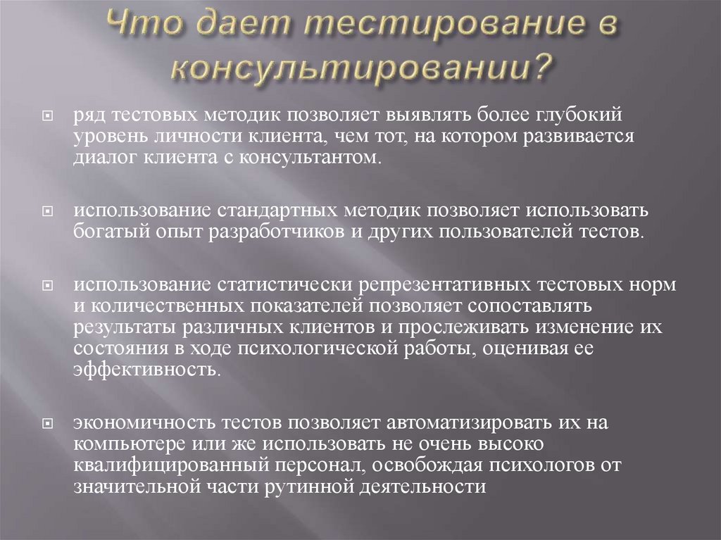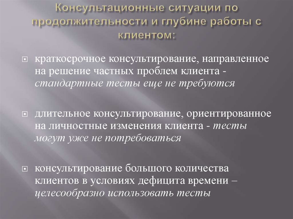 краткосрочное консультирование, направленноена решение частных проблем клиента стандартные тесты еще не требуются