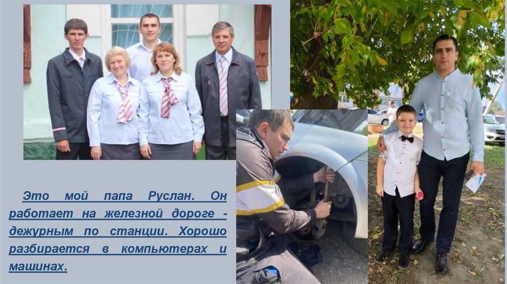 Это мой папа Руслан. Онработает на железной дороге дежурным по станции. Хорошо