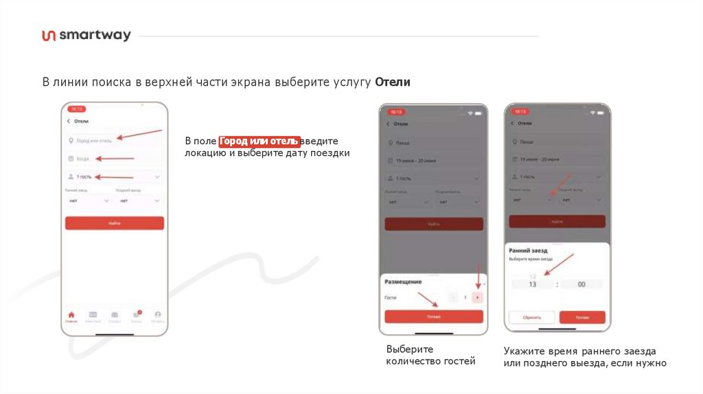 В линии поиска в верхней части экрана выберите услугу ОтелиВ поле Город или отель введите