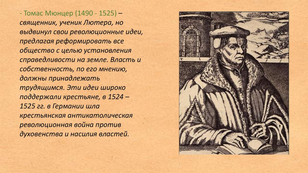 - Томас Мюнцер (1490 - 1525) –священник, ученик Лютера, но