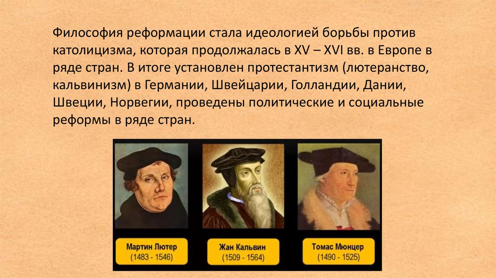 Философия реформации стала идеологией борьбы противкатолицизма, которая продолжалась в XV – XVI вв. в Европе в