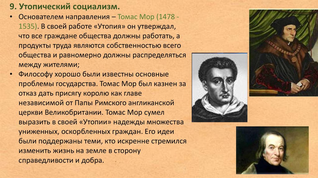 9. Утопический социализм.• Основателем направления – Томас Мор (1478 1535). В своей работе «Утопия» он утверждал,