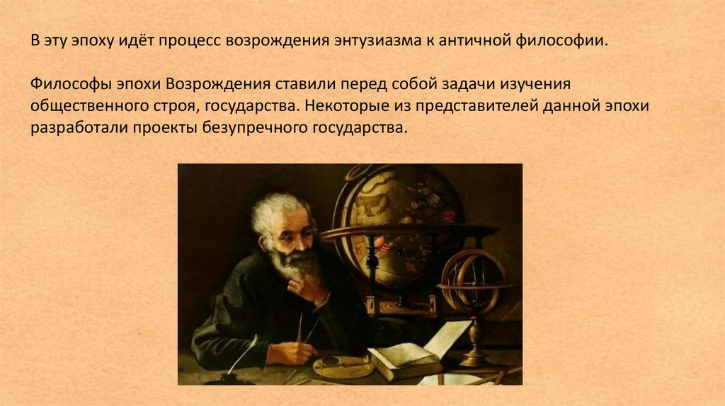 В эту эпоху идёт процесс возрождения энтузиазма к античной философии.Философы эпохи Возрождения ставили перед собой задачи изучения