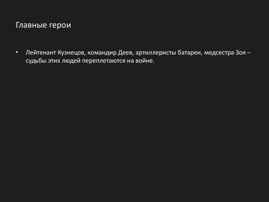 Лейтенант Кузнецов, командир Деев, артиллеристы батареи, медсестра Зоя –