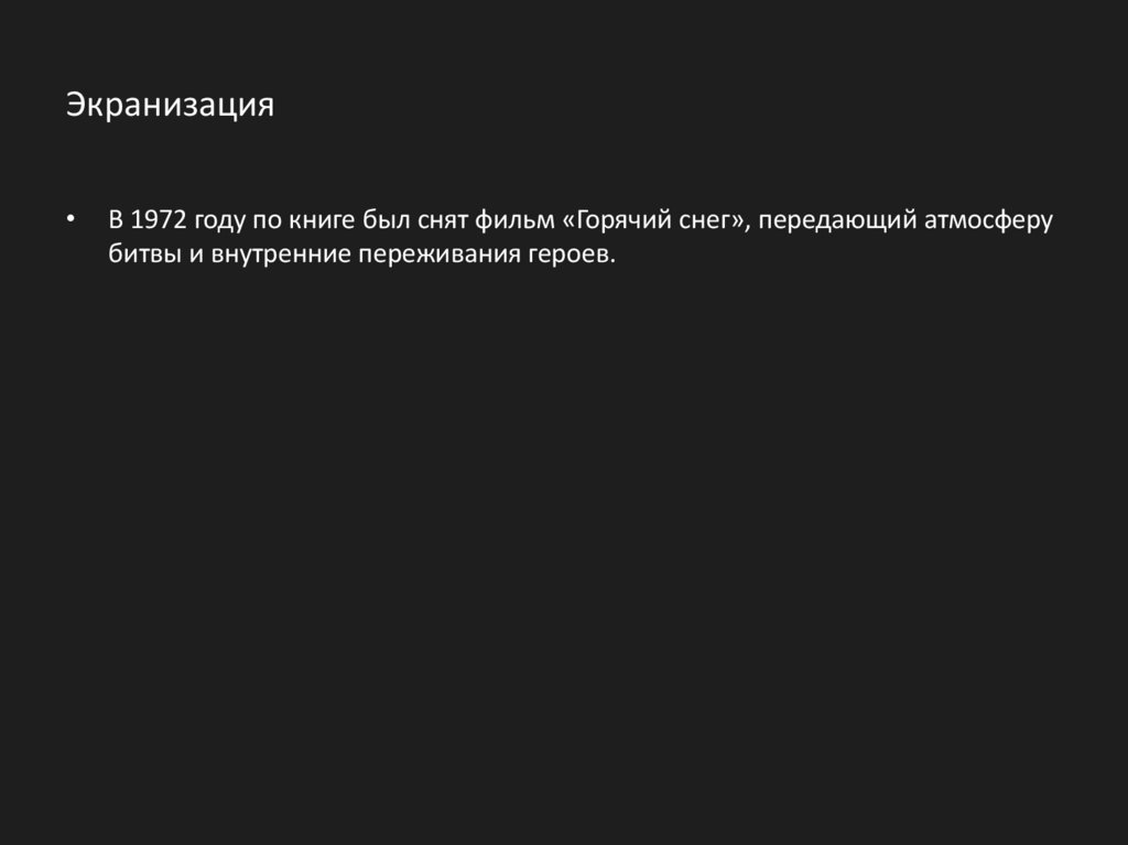 В 1972 году по книге был снят фильм «Горячий снег», передающий атмосферу