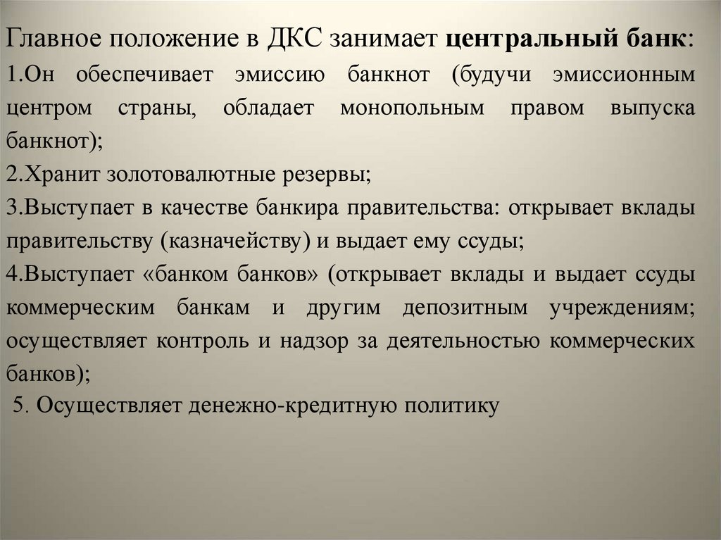 Главное положение в ДКС занимает центральный банк:1.Он обеспечивает эмиссию банкнот (будучи эмиссионным