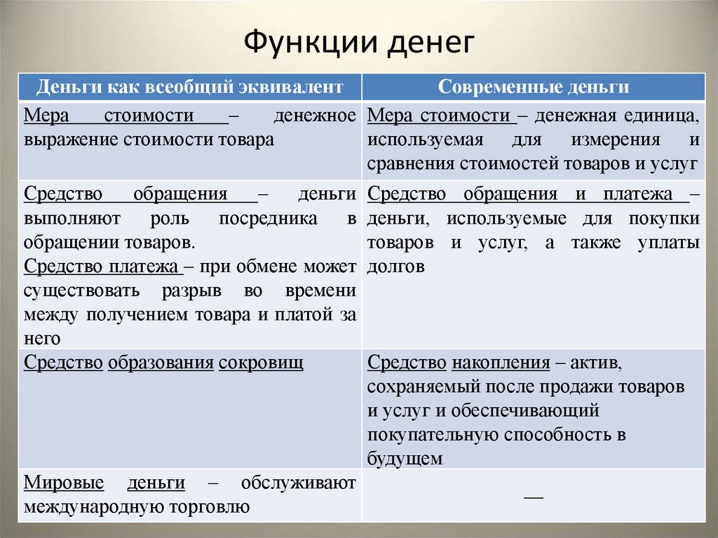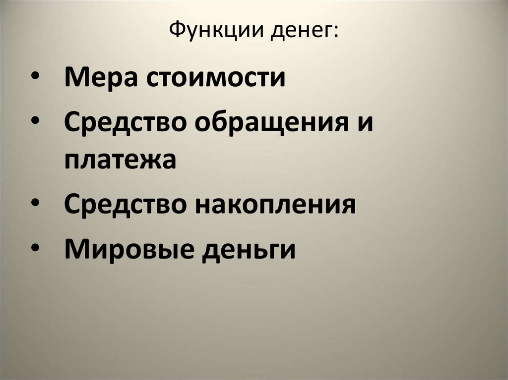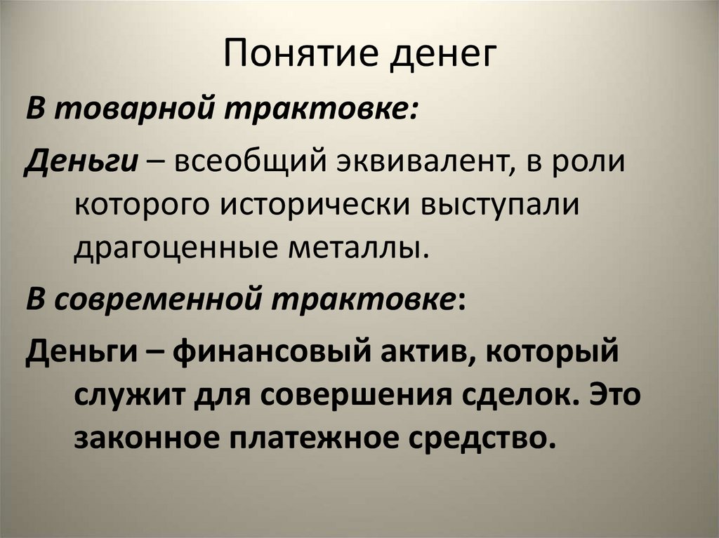 В товарной трактовке:Деньги – всеобщий эквивалент, в роли