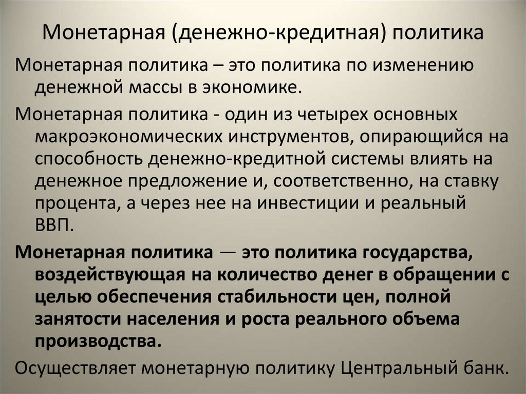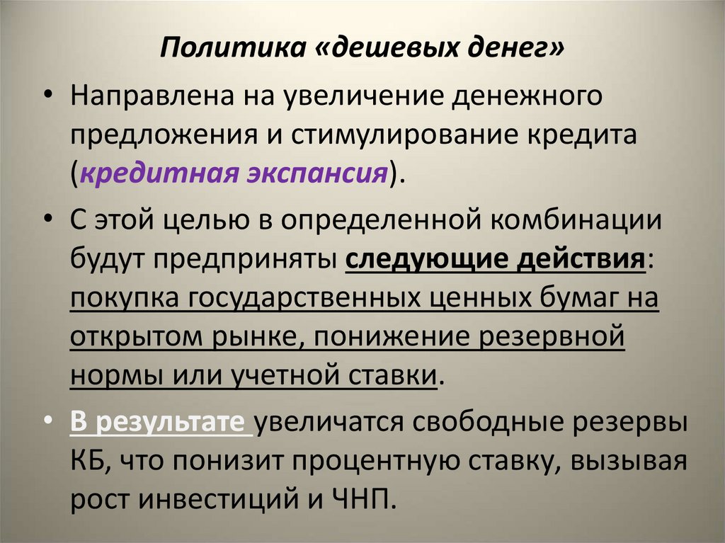 • Направлена на увеличение денежногопредложения и стимулирование кредита