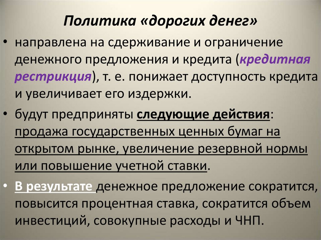 • направлена на сдерживание и ограничениеденежного предложения и кредита (кредитная