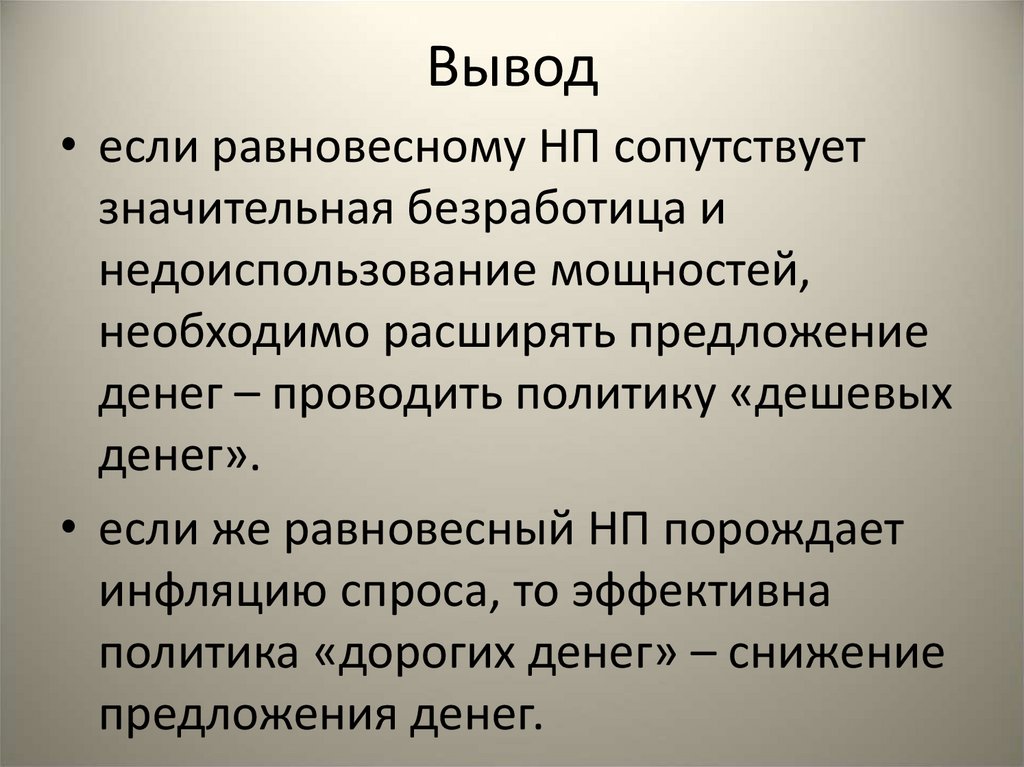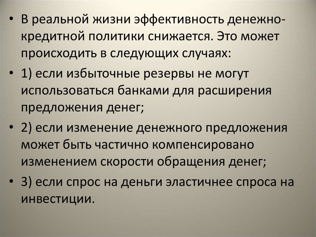 • В реальной жизни эффективность денежнокредитной политики снижается. Это можетпроисходить в следующих случаях: