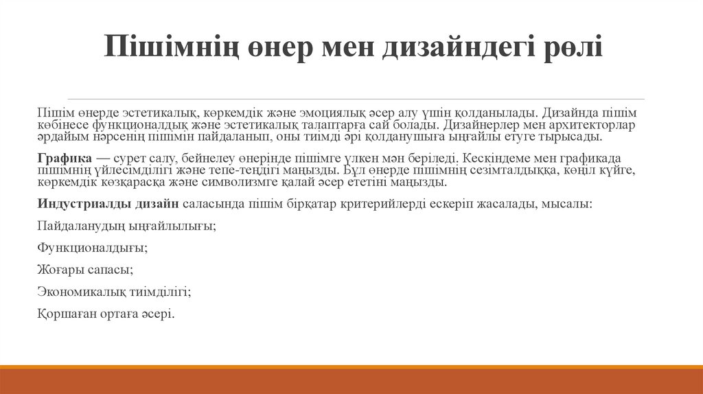 Пішімнің өнер мен дизайндегі рөліПішім өнерде эстетикалық, көркемдік және эмоциялық әсер алу үшін қолданылады. Дизайнда пішім