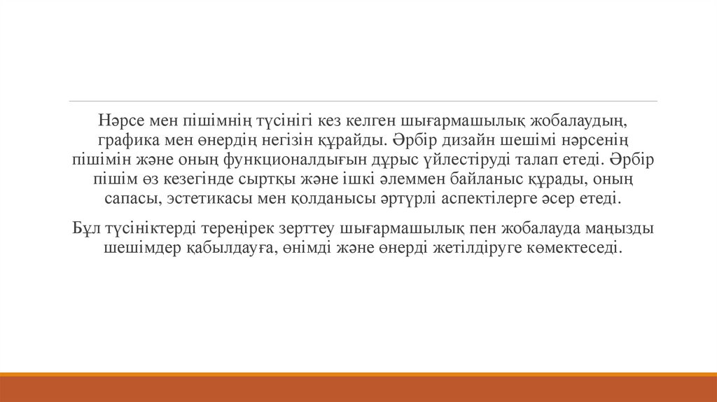 Нәрсе мен пішімнің түсінігі кез келген шығармашылық жобалаудың,графика мен өнердің негізін құрайды. Әрбір дизайн шешімі нәрсенің