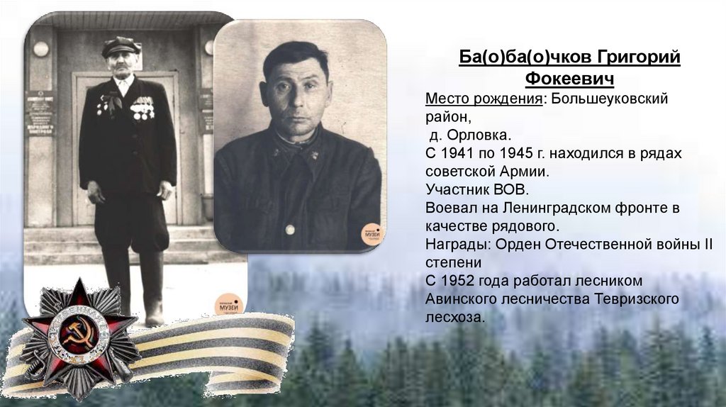 Участник ВОВ. Осенью 1941 года был призван в Армию.